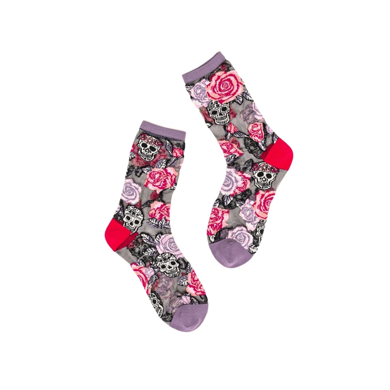 Delicate sheer mesh is layered with hauntingly beautiful embroidery, lush pink roses intertwined with intricately stitched black skulls. Finished with a dusty lavender cuff, toe, and heel. One size. Recommended fit US women's shoe sizes 5.5 - 10.