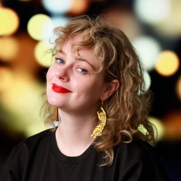 Hand-painted on sustainable wood. Made in the USA. Surgical-grade stainless steel hoops. 18kt gold PVD-coating. Hypoallergenic & nickel-free. Tarnish-free. Irritation-free. Lightweight. Dimensions: 3 x 0.8 x 0.1 inches.