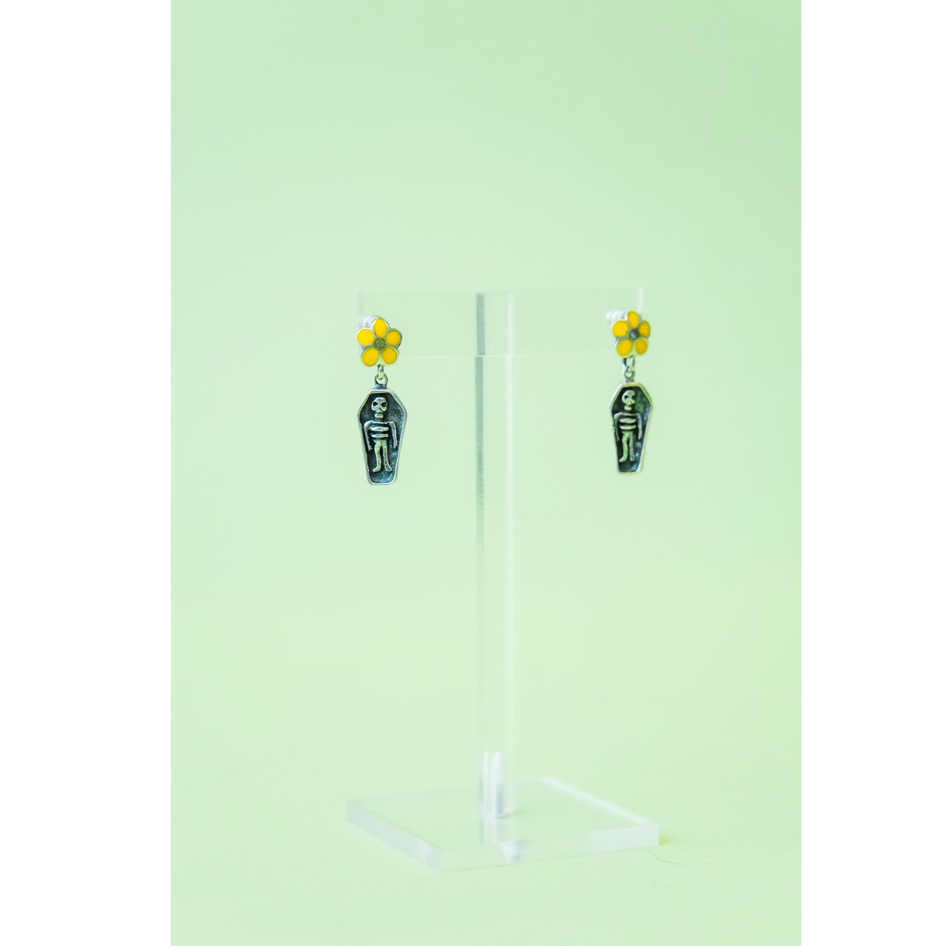 Sterling silver with skeleton inside the coffin dangle earrings embellished with a pretty yellow flower. Hallmarked on two places 925 on each earring.