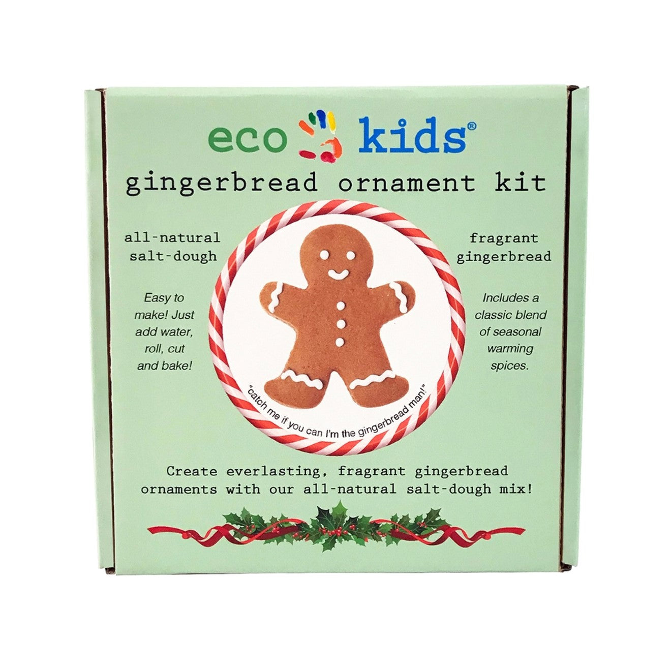 Kit includes, powdered dough mix (all natural spices in the salt-dough recipe), a gingerbread cookie cutter, a straw hole punch and ribbon. Makes up to 12 ornaments.