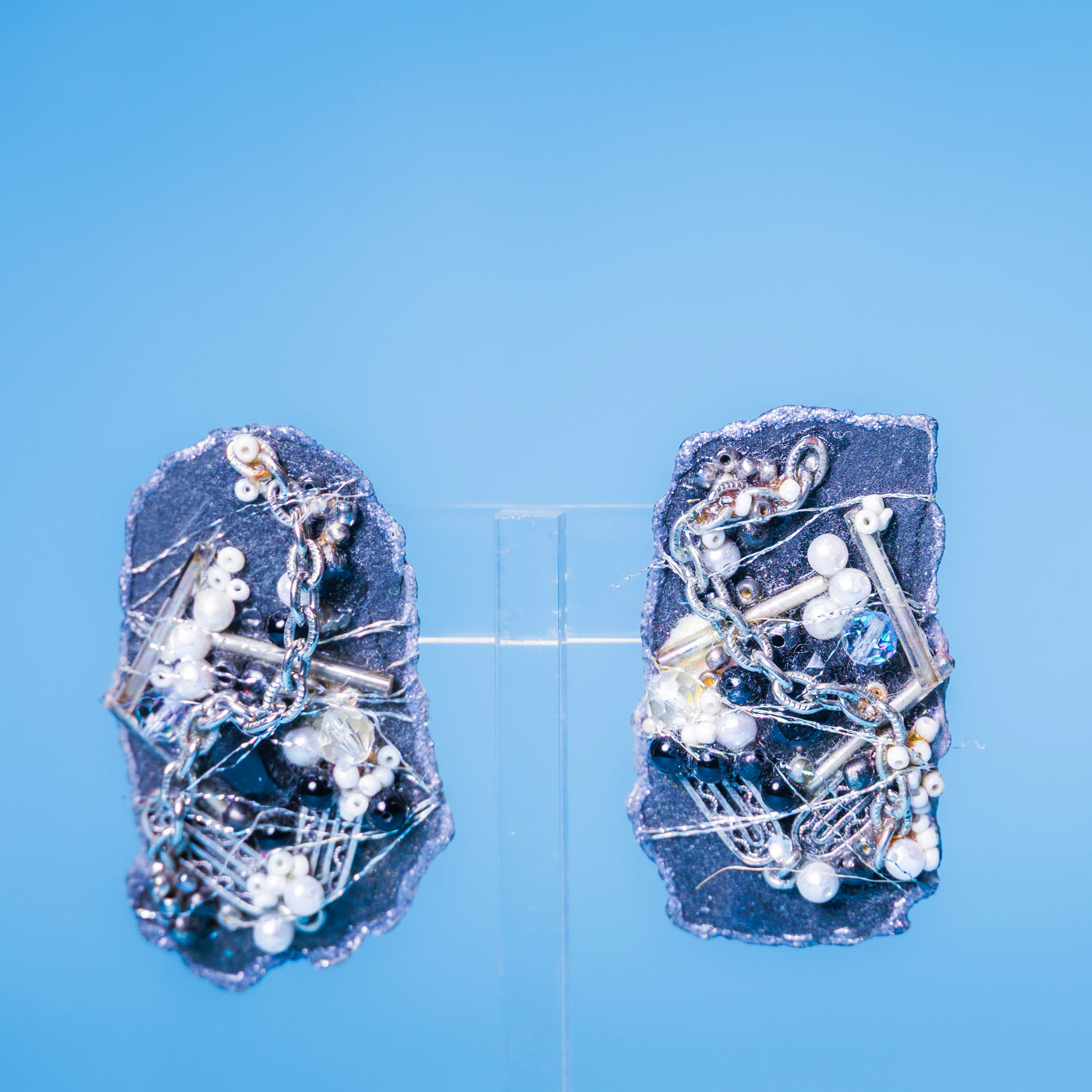 Vintage 1980s custom gray plaster, multi bead, wire, and chain earrings.
