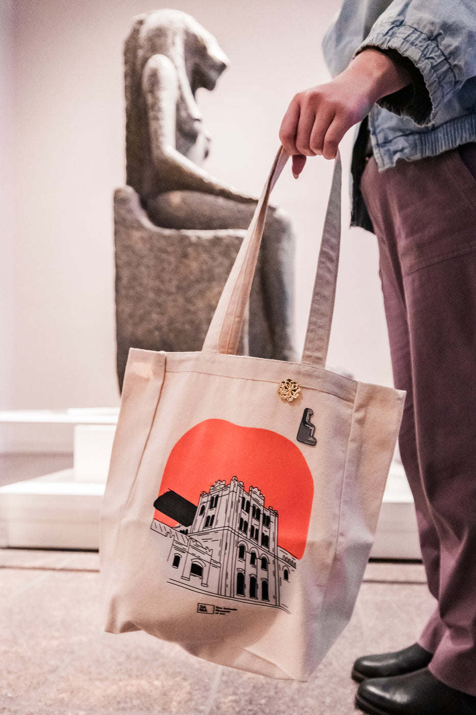 Enamel pin featuring the Statue of Sekhmet from SAMA's Ancient Mediterranean Art collection. Measures 3.8 cm long.